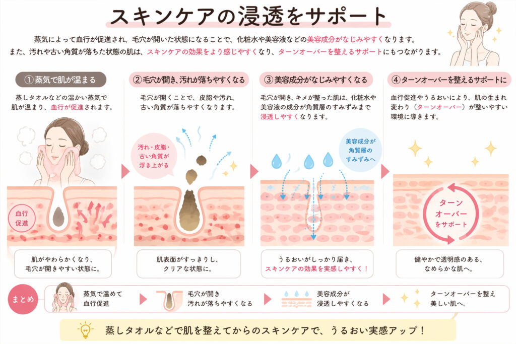 蒸気によって血行が促進され、毛穴が開いた状態になることで、化粧水や美容液などの美容成分がなじみやすくなります。また、汚れや古い角質が落ちた状態の肌は、スキンケアの効果をより感じやすくなり、ターンオーバーを整えるサポートにもつながります。