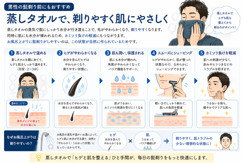 蒸しタオルの蒸気で髭にしっかり水分が行き渡ることで、毛がやわらかくなり、剃りやすくなります。同時に肌にも水分が補われるため、カミソリ負けの軽減にもつながります。お風呂上がりに髭剃りがしやすいのは、この状態が自然に作られているためです。