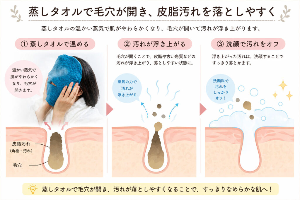 蒸しタオルで肌が温まると毛穴がゆるみ、皮脂や古い角質、毛穴汚れが浮きやすくなります。メイクを落とした後に蒸しタオルで毛穴を開かせてから洗顔すると、よりすっきりと汚れを落とすことができます。頑固な毛穴汚れや角栓が気になる場合は、クリームタイプのクレンジングをなじませた後に、蒸しタオルで顔を包み込むように軽く押さえ、約3分置いてから洗い流す方法も効果的です。